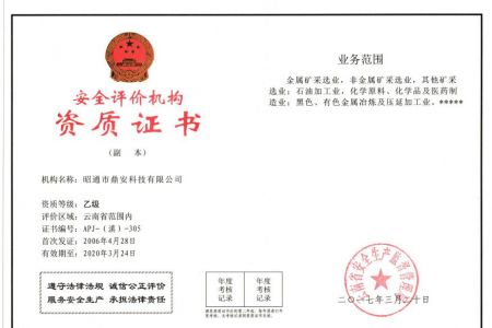 2003年11月10日,昭通市鼎安科技有限公司成立,初始主要從事第三方安全工程技術(shù)服務,經(jīng)多年運營,發(fā)展為多專業(yè)綜合科技平臺,為社會提供多種專業(yè)技術(shù)服務工作。 現(xiàn)公司注冊資金為1200萬元,公司法定代表人:毛衛(wèi)旭。公司主要業(yè)務:安全評價、安全標準化評審、安全工程技術(shù)服務;環(huán)境監(jiān)測、職業(yè)衛(wèi)生檢測、檢驗;法律訴訟及非訴訟服務;司法鑒定、固定資產(chǎn)投資項目節(jié)能服務;工程咨詢;工程測量測繪;安全教育培訓等。是安全生產(chǎn)服務、安全教育培訓機構(gòu),也是環(huán)境監(jiān)測和職業(yè)衛(wèi)生服務機構(gòu),同時也是綜合的檢測檢驗、綜合科技平臺服務機構(gòu)。多年來為公、檢、法、司、軍、警、海關(guān)、仲裁、安監(jiān)、工礦商貿(mào)企業(yè)、社會團體及個人提供多專業(yè)技術(shù)服務。